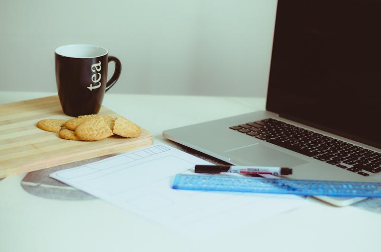 Keywords: macbook laptop computer technology office desk working creative ruler pen cookies tea cup mug business