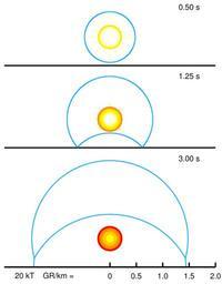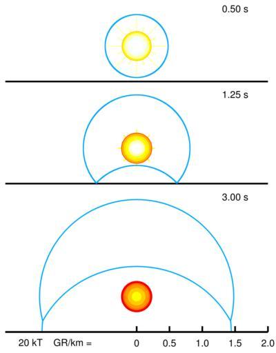 Keywords: Mach effect sequence.svg ValidSVG gnuplot Chronological sequence of the Mach-reflected detonation wave of a 20 kiloton air burst burst height 540 metres equivalent to a maximized 15 psi or 103 kPa range at 0 5 1 25 and 3 seconds after detonation The blue curve indicates the propagating shock front refraction due to fireball is neglected here Source of the data Numerical fit of blast equations from the program BLAST EXE to be found on Carey Sublette's http //nuclearweaponarchive org/Library/Nukesims html Nuclear Weapon Archive The Image has been inspired by a Figure on Glasstone Dolan 1964; see http //www abomb1 org/nukeffct/airburst html www abomb1 org by Gregory Walker de Beschreibung Chronologischer Ablauf einer 20-Kilotonnen Luftexplosion in 540 Metern Höhe von 0 5 bis 3 Sekunden nach der Zündung Die blaue Kurve stellt die Druckwelle dar die am Boden reflektiert wird und einen Mach-Effekt ausbildet Quelle der Daten Eigener numerischer Fit von Gleichungen aus dem Programm BLAST EXE zu finden in Carey Sublette's http //nuclearweaponarchive org/Library/Nukesims html Nuclear Weapon Archive Das Bild ist inspiriert von einer ähnlichen Abbildung in Glasstone Dolan 1964; siehe http //www abomb1 org/nukeffct/airburst html www abomb1 org by Gregory Walker own SiriusB 2008-11-21 Image Mach_effect_sequence png Additional Info The size and shape of the blast wave is derived by numerical calculations and thus close to reality In this version also the size of the fireball has been derived from a graph shown in Glasstone Dolan 1977 However in reality there will be a distortion and displacement of the fireball due to the passing shock wave and to a lower degree also due to the rising of the hot gases These effects have been neglected here Nuclear explosion physics Sequence Shock waves |