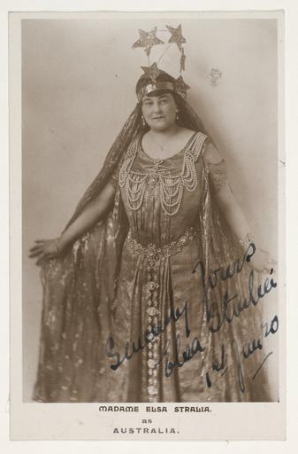 Keywords: Madame Elsa Stralia as Australia, ca. 1919 signed postcard.jpg Elsa Stralia born Elsie Mary Fischer studied singing with Elise Wiedermann and Lily Slapoffski at the Marshall-Hall Conservatorium Melbourne before leaving for Europe in 1910 She was a dramatic soprano with a huge but agile voice who sang Rossini runs like a coloratura Like Melba and Austral she changed her name to sound more like an opera singer She studied with Mathilde Marchesi and sang in Beecham's Covent Garden opera season in 1913 and later at La Scala On her Sydney debut in 1925 she received a floral representation of the ladder of fame from Amelita Galli-Curci who was touring Australia Format Postcard Find more detailed information about this photograph <a href http //acms sl nsw gov au/item/itemDetailPaged aspx itemID 442371 rel nofollow >acms sl nsw gov au/item/itemDetailPaged aspx itemID 442371</a> Search for more great images in the State Library's collections <a href http //acms sl nsw gov au/search/SimpleSearch aspx rel nofollow >acms sl nsw gov au/search/SimpleSearch aspx</a> From the collection of the State Library of New South Wales <a href http //www sl nsw gov au rel nofollow >www sl nsw gov au</a> Flickr http //flickr com/photos/29454428 N08/6031295637 Madame Elsa Stralia as Australia ca 1919 signed postcard 1919-00-01 00 00 00 http //www flickr com/people/29454428 N08 State Library of New South Wales User Flickr upload bot/upload-pd 15 29 2 November 2011 UTC Russavia PD-Australia Elsa Stralia Opera vocalists from Australia |