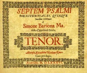 Keywords: Madelka1pic244.jpg en The cover of the Seven Pentiential Psalms for Five Voices by Simon Bar Jona Madelka Madelka Simon Bar Jona; Michl Jakub preface 2007 Sedm kajících žalmů pětihlasem vyzdobených Prague Editio Bärenreiter cover unknown printer 1586 PD-old-100 Composers |