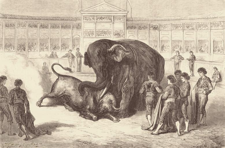 Keywords: Madrid 1863 Gustave Dore.jpg es Combate entre un toro y un elefante para L'Espagne 1862-3 de Charles Davillier File Madrid 1865 LMI jpg Le Monde Illustré Creator Gustave Doré 1860s PD-old-100-1923 Derivative versions Engravings of elephants 1862 Le Monde Illustré La Tauromachie de Gustave Doré Engravings of Madrid 1862 in Madrid Engravings of bullfighting Plaza de toros de la Puerta de Alcalá |
