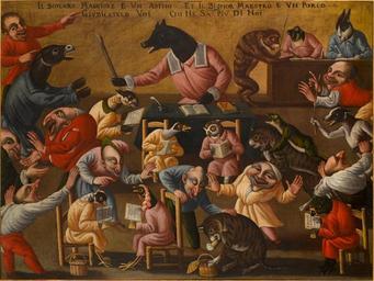 Keywords: Maestro della Fertilità dell'Uovo - Grotesque Scene with Animals and Stylised Figures No. 2.jpg Artwork creator Maestro della Fertilità dell'Uovo en Grotesque Scene with Animals and Stylised Figures No 2 17th century http //www ruzhnikov com/grotesque-scene-with-animals-and-stylised-figures-2/ oil canvas cm 90 120 The Ruzhnikov Collection Other versions PD-old-100 Maestro della Fertilità dell'Uovo Animals acting as humans in art Animals with human clothing World upside down |