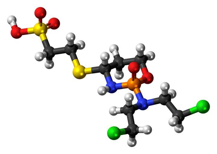 Keywords: Mafosfamide-3D-balls.png Ball-and-stick model of the mafosfamide molecule an alkylating agent being investigated as an anti-cancer drug Colour code 505050 Carbon C black<br> F0F0F0 Hydrogen H white<br> F51E1E Oxygen O red<br> 3C50FA Nitrogen N blue<br> FA8C00 Phosphorus P orange<br> FAEB00 Sulfur S yellow<br> 14F014 Chlorine Cl green<br> 2011-02-06 own DS Visualizer Jynto talk Space-filling version cc-zero Sulfonic acids Ball-and-stick models Thioethers Phosphoramidates Six-membered phosphorus heterocycles Nitrogen mustards Alkylating antineoplastic agents Images by Jynto |