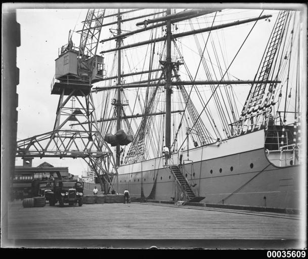 | Keywords: hood collection hoodcollection samuel j hood collection samueljhoodcollection magdalene vinnen magdalenevinnen woolloomooloo sydney german german barque germanbarque barque crew wool wool bales woolbales cargo winch sam hood samhood blackandwhite monochrome black and white This photograph depicts crew members with wool bales being winched on board the four-masted steel barque MAGDALENE VINNEN at number 2 wharf in Woolloomooloo, Sydney. The vessel sailed into Sydney Harbour on 27 February 1933, under the command of Captain Lorenz Peters. The barque was loaded with almost 16,000 bales of wool, the fourth largest shipment to have left Sydney, before it sailed the record-breaking 82-day voyage for Falmouth, England. MAGDALENE VINNEN visited Australia again in 1935, with a cargo of wheat, lifted from Port Broughton in South Australia. This photo is part of the Australian National Maritime Museum’s Samuel J. Hood Studio collection. Sam Hood (1872-1953) was a Sydney photographer with a passion for ships. His 60-year career spanned the romantic age of sail and two world wars. The photos in the collection were taken mainly in Sydney and Newcastle during the first half of the 20th century. The ANMM undertakes research and accepts public comments that enhance the information we hold about images in our collection. This record has been updated accordingly. Photographer: Samuel J. Hood Studio Collection Object no. 00035609 This photograph depicts crew members with wool bales being winched on board the four-masted steel barque MAGDALENE VINNEN at number 2 wharf in Woolloomooloo, Sydney. The vessel sailed into Sydney Harbour on 27 February 1933, under the command of Captain Lorenz Peters. The barque was loaded with almost 16,000 bales of wool, the fourth largest shipment to have left Sydney, before it sailed the record-breaking 82-day voyage for Falmouth, England. MAGDALENE VINNEN visited Australia again in 1935, with a cargo of wheat, lifted from Port Broughton in South Australia. This photo is part of the Australian National Maritime Museum’s Samuel J. Hood Studio collection. Sam Hood (1872-1953) was a Sydney photographer with a passion for ships. His 60-year career spanned the romantic age of sail and two world wars. The photos in the collection were taken mainly in Sydney and Newcastle during the first half of the 20th century. The ANMM undertakes research and accepts public comments that enhance the information we hold about images in our collection. This record has been updated accordingly. Photographer: Samuel J. Hood Studio Collection Object no. 00035609 |
