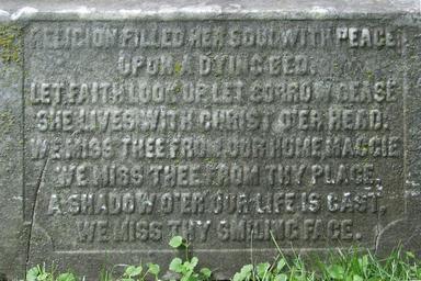 | Keywords: Maggie Schusler monument, Allegheny Cemetery, 2015-05-12, 03.jpg en Epitaph on the Maggie Schusler monument Allegheny Cemetery Pittsburgh <br /> Religion filled her soul with peace<br /> Upon a dying bed <br /> Let faith look up Let sorrow cease<br /> She lives with Christ o ™erhead <br /> We miss thee from our home Maggie <br /> We miss thee from thy place <br /> A shadow o ™er our life is cast <br /> We miss thy smiling face <br /> 2015-05-12 13 53 19 own Cbaile19 other versions cc-zero Uploaded with UploadWizard Allegheny Cemetery Pittsburgh |