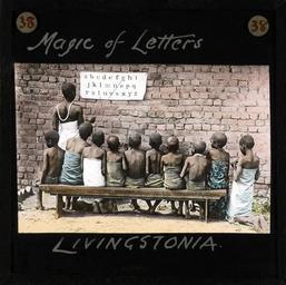 | Keywords: "Magic of Letters, Livingstonia" Malawi, ca.1895 (imp-cswc-GB-237-CSWC47-LS3-1-038).jpg en <br> Magic of Letters Livingstonia Malawi ca 1895 Photograph of a group of African children during a reading class The children are sitting on a bench learning the letters of the english alphabet which is pinned to a wall in front of them Photographer Unknown Filename imp-cswc-GB-237-CSWC47-LS3-1-038 tif Coverage date circa 1895 Part of collection International Mission Photography Archive ca 1860-ca 1960 Type images Part of subcollection Photographs from the Centre for the Study of World Christianity University of Edinburgh U K ca 1900-ca 1940s Repository name Centre for the Study of World Christianity Archival file impaunpub_Volume7/1424 url Repository address The University of Edinburgh School of Divinity New College Mound Place Edinburgh EH1 2LX United Kingdom Geographic subject country Malawi Format aacr2 1 lantern slide 8 x 8 cm Geographic subject continent Africa Rights Contact the repository for details Part of series Elmslie of the Wild Ngoni LS3/1 Repository email divinity-CSWC ed ac uk Subject lcsh Keyword Education; Children Date created circa 1895 Publisher of the digital version University of Southern California Libraries Subject aat genre group portraits Format aat lantern slides Legacy record ID impa-m68434 Access conditions http //www ed ac uk/schools-departments/divinity/research/centres/world-christianity/collections-resources File GB 237 CSWC47/LS3/1/38 1895 author http //digitallibrary usc edu/cdm/ref/collection/p15799coll123/id/64545 PD-old-70-1923 Magic lantern images Images from USC Digital Library uploaded by Fæ International Mission Photography Archive ca 1860-ca 1960 History of Malawi Livingstonia Rumphi District Ethnic groups in Malawi |