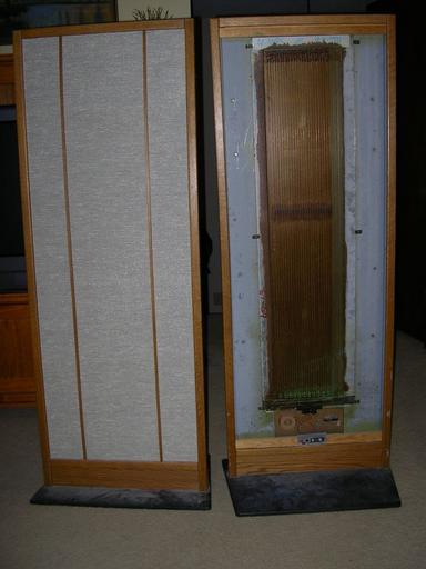 Keywords: Magnepan MG1.jpg A pair of late 1970's Magnepan MG-1 speakers The speaker on the right has had its cover removed revealing the planar drivers This is a sheet of Mylar with a larger region of heavier gauge wire glued on to form the bass/midrange area and a smaller area of finer wire producing the treble The Mylar sheet is tensioned a few millimeters above matching rows of permanent magnets so that the whole sheet vibrates like a drum skin when current from an amplifier is passed The large surface area means the sheet is well damped by the air it moves Being very light the sheet can stop and start noticeably quickly This characteristic combined with the lack of chesty colouration caused by a speaker box is what makes the addictively realistic Magnepan sound Later and more expensive models also use a true ribbon tweeter to extend the treble range These units are renowned for their speed accuracy and complete lack of spit and sizzle There are a couple of minor drawbacks They are large; approximately the size and shape of a smallish interior door and to produce enough bass room placement is very important due to the motion of the mylar sheet suffering cancellation by reflected sound waves People who love these speakers but are forced to adopt disadvantageous room positioning may resort to using a high quality sub-woofer Magnepan remain popular today and provide a true high end sound at a reasonable price Current models are listed at Magnepan's site http //www magnepan com/ Magnepan 2005-08-23 own assumed Adol Christin~commonswiki Loudspeakers |