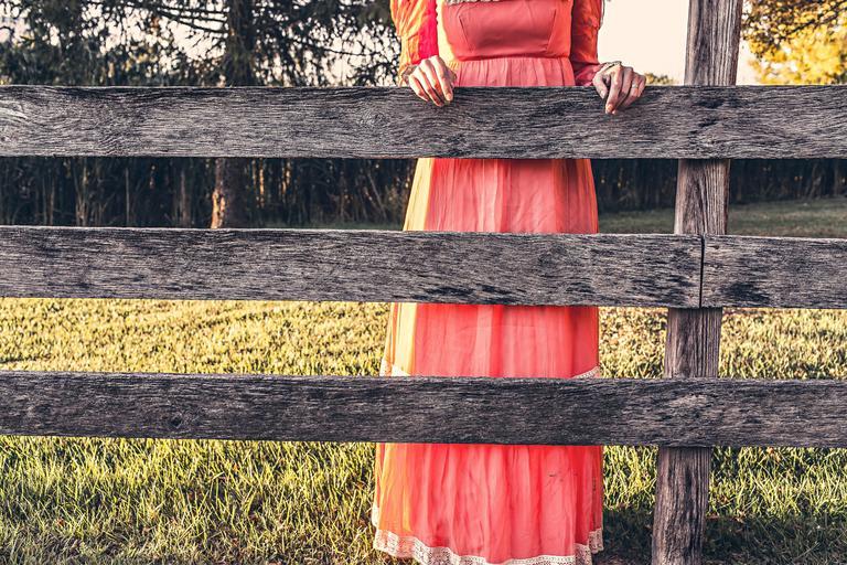 Keywords: maid maiden fence countryside dress red casual traditional standing waiting girl woman lady young female pink wood country grass field