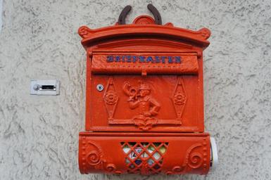 Keywords: mailbox old red metal post house entrance blacksmithing letter boxes