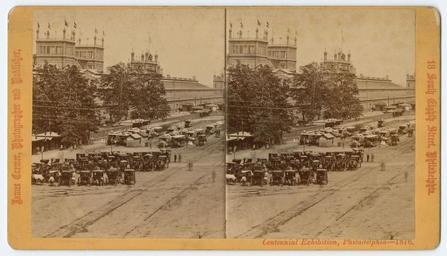 Keywords: transportation james cremer jamescremer library company of philadelphia librarycompanyofphiladelphia centennial exhibition centennialexhibition stereographs philadelphia main building mainbuilding photo border Shows the Main Building and a nearby transportation center on the grounds of the Centennial Exhibition of 1876 in Philadelphia, Pa. The Main Building extends into the background. Next to the building is a transportation area with carriages and people. Accession number: P.2011.47.646 Shows the Main Building and a nearby transportation center on the grounds of the Centennial Exhibition of 1876 in Philadelphia, Pa. The Main Building extends into the background. Next to the building is a transportation area with carriages and people. Accession number: P.2011.47.646 |