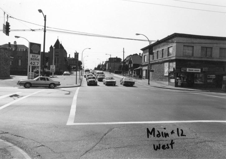 Keywords: blackandwhite monochrome outdoor road intersection vehicle car black and white Main Street at East 12th Avenue looking west, circa-1980. [City of Vancouver Archives photo] Main Street at East 12th Avenue looking west, circa-1980. [City of Vancouver Archives photo] |