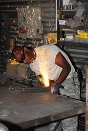 Keywords: Maintenance troops keep FOB running DVIDS60425.jpg en Spc John H Price a welder and a native of Port Arthur Texas works on a project in the welding section of the Company G 2nd Battalion 17th Field Artillery maintenance bay Price is on his second deployment previously serving in Ar Ramadi Iraq 2007-10-04 Spc Courtney Marulli https //www dvidshub net/image/60425 60425 2007-10-04 13 57 FORWARD OPERATING BASE LOYALTY IQ PD-USGov Port Arthur Texas Images from DoD uploaded by Fæ