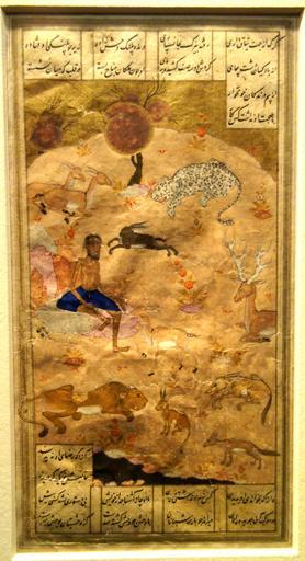 Keywords: Majnun in the Desert among the Animals, unknown artist, Iran, c. 1500 AD, page from unidentified manuscript of the Khamsa of Nizami, opaque watercolors, ink, and gold on paper - Cincinnati Art Museum - DSC04209.JPG en Exhibit in the Cincinnati Art Museum Cincinnati Ohio USA This artwork is in the public domain because the artist died more than 70 years ago Photography was permitted in the museum without restriction 2013-05-14 11 44 12 own Daderot cc-zero Near Eastern paintings in the Cincinnati Art Museum Uploaded with UploadWizard Leyli and Majnun Nizami Ganjavi Safavid paintings |