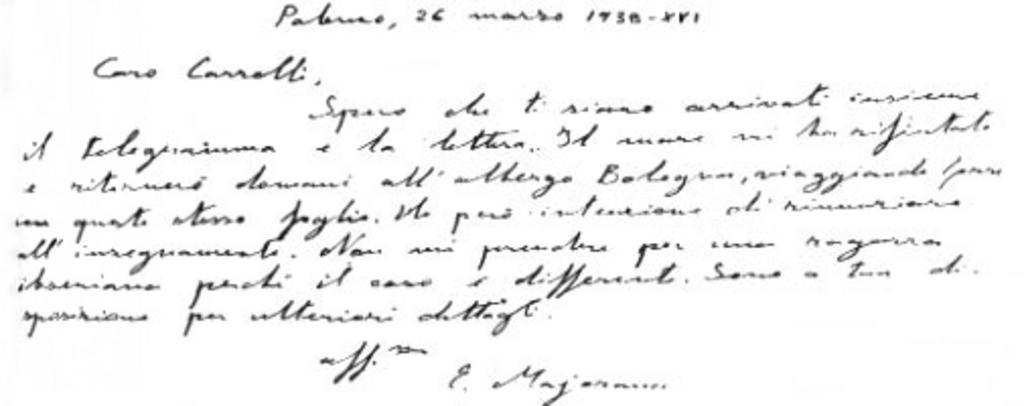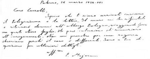 Keywords: Majorana Last letter.jpg ibseniana perché il caso è differente Sono a tua disposizione per ulteriori dettagli http //www cataniaperte com/scienza/ettoremajorana/sinistra htm Ettore Majorana 1906-1938 1938 3 26 PD-Old Ettore Majorana Manuscript letters written messages Fascist calendar - Year XVI ImageNote 1 12 2 488 191 505 200 2 Palermo 26 marzo 1938 - XVI Caro Carrelli Antonio n d r Spero ti siano arrivati insieme il telegramma e la lettera Il mare mi ha rifiutato e ritornerò domani all'albergo Bologna viaggiando forse con questo stesso foglio Ho però intenzione di rinunziare all'insegnamento Non mi prendere per una ragazza ibseniana perché il caso è differente Sono a tua disposizione per ulteriori dettagli Aff mo E Majorana ImageNoteEnd 1 |