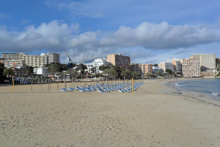 Keywords: majorca palma palm trees beach sand sea holiday water view rest sunbath tanning the sun the coast summer holidays hotel buildings deck chairs