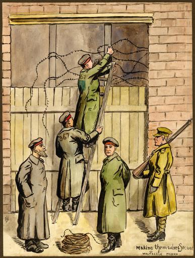| Keywords: university of victoria universityofvictoria uvic great britain. army. royal regiment of artillery greatbritainarmyroyalregimentofartillery caricatures and cartoons--20th century caricaturesandcartoons20thcentury notebooks war artists warartists world war, 1914-1918--pictorial works worldwar19141918pictorialworks world war, 1914-1918--caricatures and cartoons worldwar19141918caricaturesandcartoons drawing people vehicle bike surreal photo border Item is one of 123 pen-and-ink drawings and watercolours from two volumes titled: "Sketches of the War: France/Belgium". The sketches vary from satirical cartoons to more detailed and naturalistic renditions. They are often accompanied by an ironic title and are often signed with the artist's initials, "J.M." The artist's satirical targets include the officers and high command of both combatant sides; the disjuncture between reported and actual events, and the death of civilians as a fact of modern warfare. Item is one of 123 pen-and-ink drawings and watercolours from two volumes titled: "Sketches of the War: France/Belgium". The sketches vary from satirical cartoons to more detailed and naturalistic renditions. They are often accompanied by an ironic title and are often signed with the artist's initials, "J.M." The artist's satirical targets include the officers and high command of both combatant sides; the disjuncture between reported and actual events, and the death of civilians as a fact of modern warfare. |