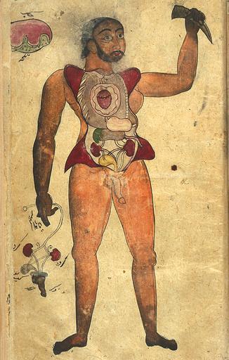 Keywords: Male figure by Muḥammad Arzānī.jpg anatomy of man made by Muḥammad Arzānī d 1722/ 1134 ink and opaque watercolors of a male figure with his abdomen and chest opened to reveal the internal organs India original book now is in http //www nlm nih gov/hmd/arabic/images/p20555a jpg Permission PD-Art Diagrams of the human anatomy |