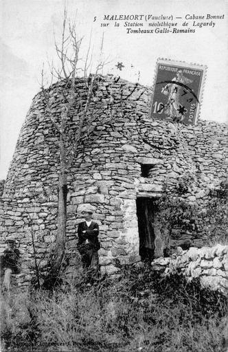 | Keywords: Malemort cabane Bonnet.jpg en Dry stone hut going by the name of cabane Bonnet at Malemort-du-Comtat Vaucluse France fr Cabane en pierre sèche dite cabane Bonnet à Malemort-du-Comtat Vaucluse France own Christian Lassure Early 20th century / Début du XXe siècle Cc-zero Dry stone huts in France Malemort-du-Comtat Postcards of Vaucluse Malemort-du-Comtat Postcards of villages in France | ||||