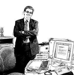 Keywords: man desk office computer monitor keyboard phone desk pad table top filing cabinet aktenordner comic suit tie profession job career file swivel chair stress everyday life earn money employee leave paperwork office furnishing lean on stand ajar arms crossed pride work hamster wheel routine dress code