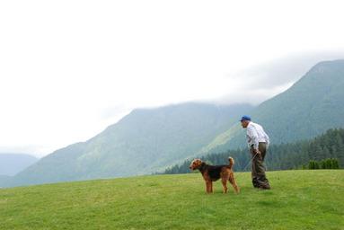 Keywords: man dog airdale terrier hiking nature landscape friendship