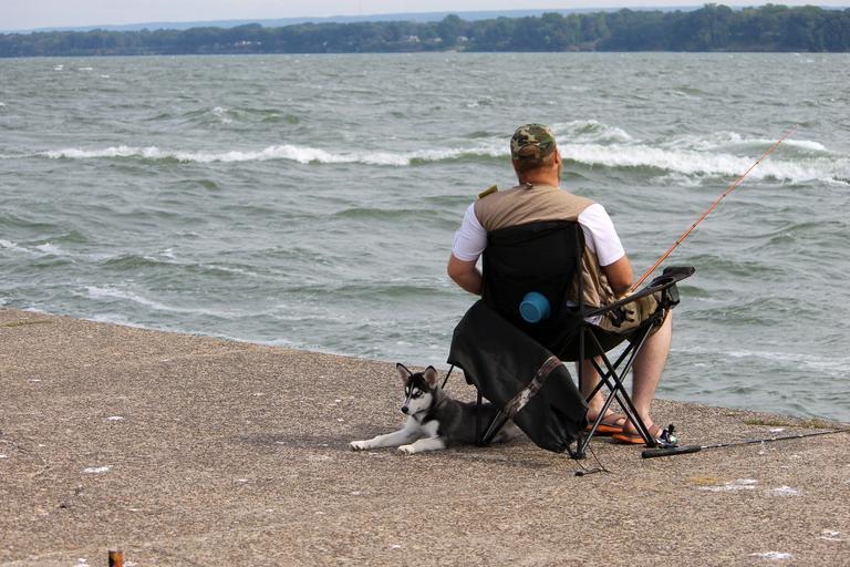 Keywords: man dog fish fishing water background pet animal people male adult person puppy husky friendship