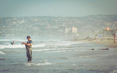 Keywords: man fishing fisherman hat beach sand water waves shore people sunshine summer kid boy houses hills