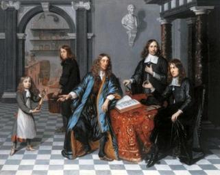 Keywords: Man Group portrait.jpg Artwork Creator Cornelis de Man s 1670 oil canvas cm 90 112 Institution National Museum Warsaw 1 accession number 27 object history ProvenanceEvent 1862 purchase Museum of Fine Arts Warsaw Johann Peter Weyer credit line The laboratory room in the background refers to the workshop of Johannes Conradus Barchusen at the University of Utrecht ed Janina Michałkowa 1964 Galeria Malarstwa Obcego przewodnik p 111 Jan Białostocki 1962 The Weyer Collection and the beginning of the Warsaw Art Museum in Bulletin du Musée National de Varsovie cat no 31 p 57 http //www maius uj edu pl/uczony/obiekty/16-cd jpg www maius uj edu pl See below PD-old-100 DEFAULTSORT 1670s; Group portrait Cornelis de Man 17th-century paintings in the National Museum in Warsaw Genre paintings in the National Museum in Warsaw Dutch paintings in the National Museum in Warsaw Chemists from Poland History of chemistry Laboratories in art 17th-century group portraits 1670s portrait paintings Portraits with table carpets 17th-century portrait paintings in interiors Busts in portrait paintings Portrait paintings with arches Johann Conrad Barchusen Checkered floors in art |