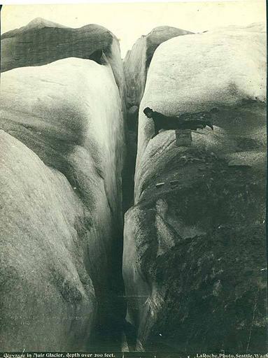 Keywords: Man peering into crevasse, Muir Glacier, Alaska, ca 1897 (LAROCHE 109).jpeg Photograph Creator Frank La Roche Caption on image Crevasse in Muir Glacier depth over 200 feet Advertisement on photograph equipment box reads La Roche views Subjects LCTGM Glaciers--Alaska Subjects LCSH Muir Glacier Alaska ; Glacial crevasses--Alaska depicted place Muir Glacier ca 1897 Institution University of Washington UWASH-LAROCHE-source accession number laroche 109 PD-old-auto-1923 1936 Information field Order Number LAR103 Muir Glacier Crevasses in Alaska Alaska in the 1890s Black and white photographs |