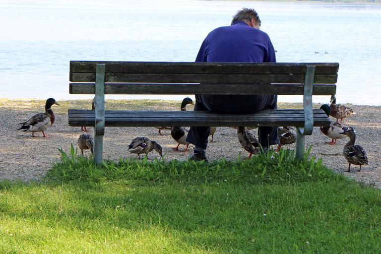 Keywords: man person ducks feed bench human animals rest sit nature lake click individually relax alone mood relaxation break water bank seat holiday summer waters idyll