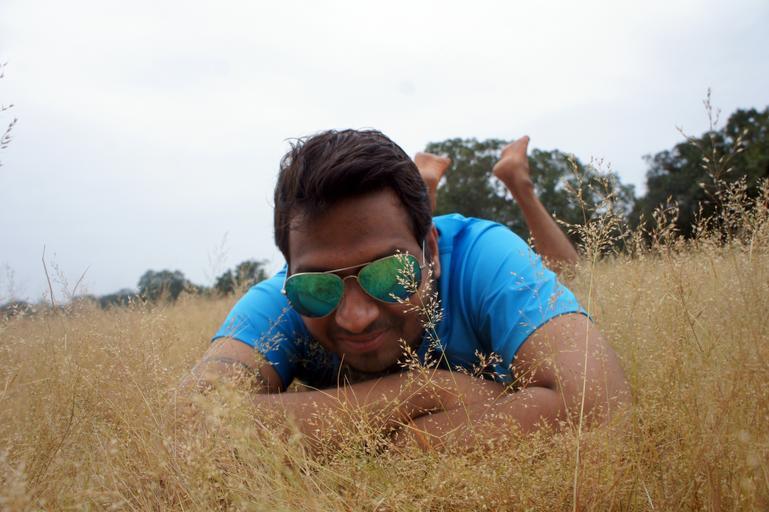 Keywords: man relax hay dry grass grass field haystack outdoor blue nature sunny travel field glares journey land season glasses sunglasses