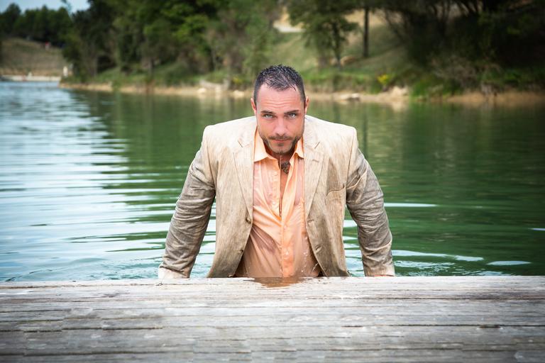 Keywords: man river nature holiday relaxation model wetswimmong in rags costume
