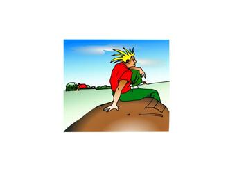 Keywords: man sitting thinking outdoors rock blond hair person colourful red green dress looking away