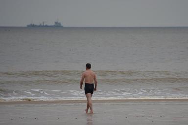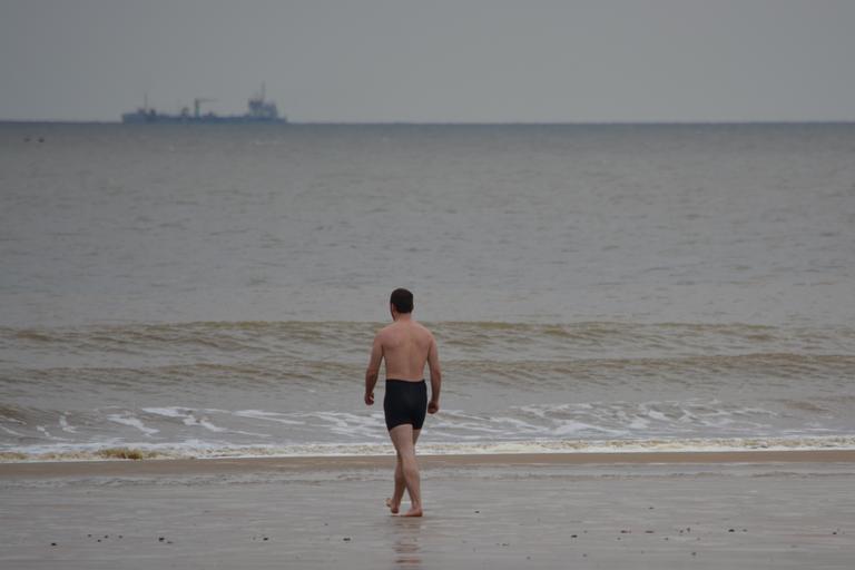 Keywords: man swimming trunks sea swimming steps people determination north sea horizon