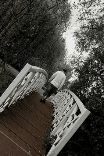 Keywords: man walking crossing park summer spring nature river riverside bridge think thinking sad sadness depressed lonely cry feeling feel black white old life