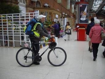 | Keywords: Man with bike at Marylebone Station, London.jpg en Cycling is the cheapest natural aerobic exercise and greenest form of transportation in cycle friendly city's A Senior citizen backpacker cyclist in London own Rudolph A furtado Cycling in London |