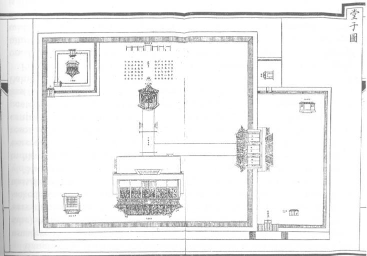 Keywords: Manchu shamanic shrine in Beijing.jpg shamanic shrine Manchu tangse; Chinese tangzi 堂子 in Beijing where the Manchu emperors of the Qing dynasty 1644 1900 performed sacrifices to Heaven Following Chinese cartographic conventions the north is at the bottom of the picture and the south on top 1899 possibly copied from a previous edition of the Da Qing huidian tu shili Qinding Da Qing Huidian tu shili 欽定大清 典 事例 Imperially collected statutes diagrams and substatutes of the Great Qing 1899 Reprint Taipei Zhongwen 1963 p 1117 Scanned from Susan Naquin Peking Temples and City Life 1400 1900 Berkeley and Los Angeles University of California Press 2000 p 384 ISBN 0-520-21991-0 alk paper hardcover Naquin's accompanying caption reads as follows Located off of the southeast corner of the Imperial City the Tangzi was intended for the private shamanistic rites of the Manchu elite This complex was destroyed in 1900 and rebuilt inside the palace; the Italian legation was constructed on the site A nineteenth-century team of editors PD-old-100 PD-China 1899 in Beijing Qing Dynasty Religion in China Shamanism |
