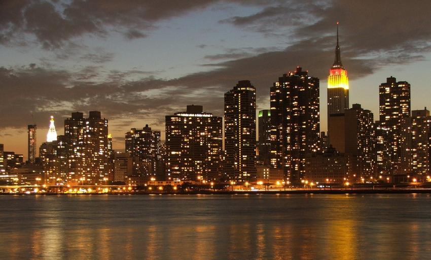 Keywords: manhattan midtown cityscape skyline view dusk evening twilight lights sunset metropolitan water reflection landmark nyc new york city urban metropolis river skyscraper usa scenic