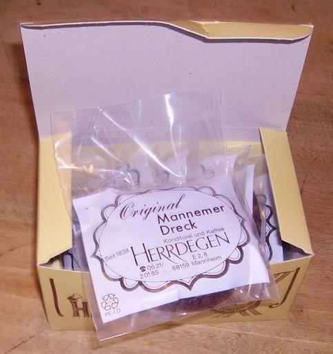Keywords: Mannheimer Dreck Verpackung.jpg specialty of Mannheim Germany 2006-02-26 own Immanuel Giel Konditorei Kaffee Herrdegen Mannheimer Dreck