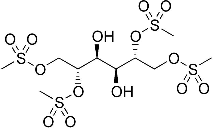 Keywords: Mannosulfan.png en chemical structure of mannosulfan Own Edgar181 2008-07-17 Mesylate esters Alkylating agents Chemotherapeutic agents Monosaccharides