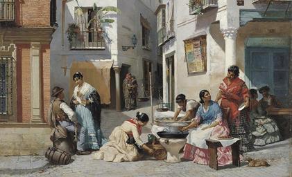 Keywords: Manuel Wssel de Guimbarda Vendedoras de rosquillas en Sevilla - ca. 1880.jpg es Vendedoras de rosquillas en una calle de Sevilla en Rosquilla Sellers in a Corner of Seville Oil on canvas 107 x 81 cm Inv CTB 1987 29 Institution Museo Carmen Thyssen http //www carmenthyssenmalaga org/en/obra/168 Creator Manuel Ussel de Guimbarda 1881 http //sevillaciudad sevilla abc es/reportajes/casco-antiguo/cultura-casco-antiguo/un-viaje-todo-color-por-la-sevilla-costumbrista/ PD-old-100 Paintings by Manuel Ussel de Guimbarda Paintings in the Museo Carmen Thyssen Málaga Street vendors in art 19th-century painters from Spain 1881 in Spain Paintings of Seville Manila shawls Pottery in Spanish painting |