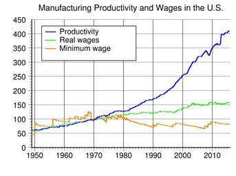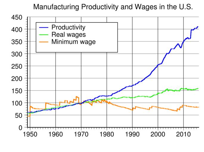 Keywords: Manufacturing productivity and wages in the United States.svg translate yes en Productivity of manufacturing labor in comparison to the average real wages of those workers and the minimum wage in the USA 1949-2016 each indexed to 1970 100 In 1970 the minimum wage was raised from 1 30 per hour to 1 45 per hour and roughly tracked inflation and productivity from about 1950 to 1969 and would have been 46 80 for manufacturing in 2015 to be the same as it was in 1970 Data from http //www bls gov/lpc/tables htm BLS 2016-03-27 own Delphi234 other versions current annually Generated with Wikimedia SVG Chart SVG Chart/box cc-zero Economic charts of the United States Statistics of the United States Labour Wage charts of the United States Productivity Minimum wage in the United States |