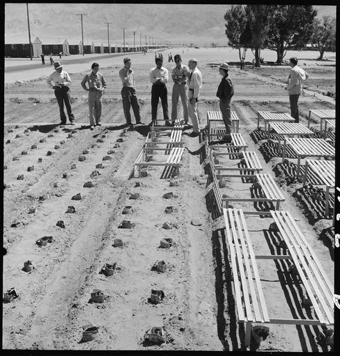 Keywords: Manzanar Relocation Center, Manzanar, California. Guayule plantings are being inspected by Doctor R . . . - NARA - 538018.tif Scope and content The full caption for this photograph reads Manzanar Relocation Center Manzanar California Guayule plantings are being inspected by Doctor Robert Emerson third from right a bio-chemist and botanist from the California Institute of Technology and director of the quayule rubber experiment He is here shown conferring with several of his staff of young evacuee scientists at Plot 4 There are 408 plants in this plot that have been in the ground for ten days General notes 538018 Local identifier 210-G-C724 Department of the Interior War Relocation Authority 02/16/1944 - 06/30/1946 NARA-Author Lange Dorothea 1895-1965 Photographer 1372774 <br /> Still Picture Records Section Special Media Archives Services Division NWCS-S National Archives at College Park 8601 Adelphi Road College Park MD 20740-6001 1942-06-28 Record group Record Group 210 Records of the War Relocation Authority 1941 - 1989 Record group ARC 537 Central Photographic File of the War Relocation Authority compiled 1942 - 1945 Series ARC 536000 File unit File unit ARC Variant control numbers NAIL Control Number NWDNS-210-G-C724 yes Other versions <gallery> File Manzanar_Relocation_Center _Manzanar _California _Guayule_plantings_are_being_inspected_by_Doctor_R_ _ _ _-_NARA_-_538018 tif tif File Manzanar_Relocation_Center _Manzanar _California _Guayule_plantings_are_being_inspected_by_Doctor_R_ _ _ _-_NARA_-_538018 jpg jpg </gallery> NARA-cooperation PD-USGov Photographs by Dorothea Lange of Manzanar War Relocation Center NARA TIF images with categorized JPGs |