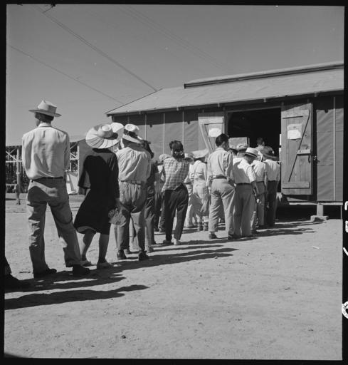 Keywords: Manzanar Relocation Center, Manzanar, California. Evacuees of Japanese ancestry at this War Relocat . . . - NARA - 537970.jpg Scope and content The full caption for this photograph reads Manzanar Relocation Center Manzanar California Evacuees of Japanese ancestry at this War Relocation Authority center line up at warehouse Number 26 for their allotment of soap Four bars of soap are distributed to each apartment on designated days One representative of each apartment room must appear presenting his identification tag General notes 537970 Local identifier 210-G-C673 Department of the Interior War Relocation Authority 02/16/1944 - 06/30/1946 NARA-Author Lange Dorothea 1895-1965 Photographer 1372774 <br /> Still Picture Records Section Special Media Archives Services Division NWCS-S National Archives at College Park 8601 Adelphi Road College Park MD 20740-6001 1942-07-01 Record group Record Group 210 Records of the War Relocation Authority 1941 - 1989 Record group ARC 537 Central Photographic File of the War Relocation Authority compiled 1942 - 1945 Series ARC 536000 File unit File unit ARC Variant control numbers NAIL Control Number NWDNS-210-G-C673 Other versions <gallery> File Manzanar_Relocation_Center _Manzanar _California _Evacuees_of_Japanese_ancestry_at_this_War_Relocat_ _ _ _-_NARA_-_537970 tif tif File Manzanar_Relocation_Center _Manzanar _California _Evacuees_of_Japanese_ancestry_at_this_War_Relocat_ _ _ _-_NARA_-_537970 jpg jpg </gallery> NARA-cooperation PD-USGov Photographs by Dorothea Lange of Manzanar War Relocation Center |
