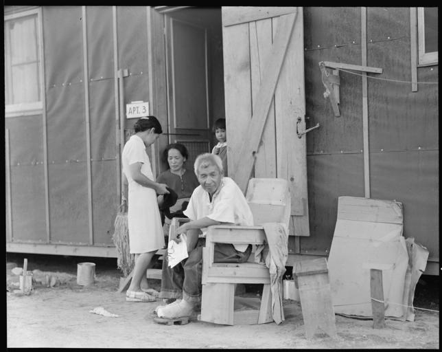 | Keywords: Manzanar Relocation Center, Manzanar, California. Evacuees family of Japanese ancestry relax in fro . . . - NARA - 537990.jpg Scope and content The full caption for this photograph reads Manzanar Relocation Center Manzanar California Evacuees family of Japanese ancestry relax in front of their barrack room at the end of day The father is a worker on the farm project at this War Relocaton Authority center Note the chair which was made of scrap lumber and the wooden shoes known as Getas made by evacuees General notes 537990 Local identifier 210-G-C693 Department of the Interior War Relocation Authority 02/16/1944 - 06/30/1946 NARA-Author Lange Dorothea 1895-1965 Photographer 1372774 <br /> Still Picture Records Section Special Media Archives Services Division NWCS-S National Archives at College Park 8601 Adelphi Road College Park MD 20740-6001 1942-07-03 Record group Record Group 210 Records of the War Relocation Authority 1941 - 1989 Record group ARC 537 Central Photographic File of the War Relocation Authority compiled 1942 - 1945 Series ARC 536000 File unit File unit ARC Variant control numbers NAIL Control Number NWDNS-210-G-C693 Other versions <gallery> File Manzanar_Relocation_Center _Manzanar _California _Evacuees_family_of_Japanese_ancestry_relax_in_fro_ _ _ _-_NARA_-_537990 tif tif File Manzanar_Relocation_Center _Manzanar _California _Evacuees_family_of_Japanese_ancestry_relax_in_fro_ _ _ _-_NARA_-_537990 jpg jpg </gallery> NARA-cooperation PD-USGov Photographs by Dorothea Lange of Manzanar War Relocation Center Geta footwear |