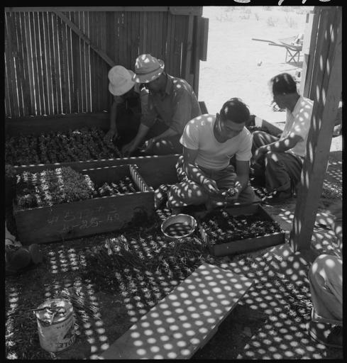 Keywords: Manzanar Relocation Center, Manzanar, California. A view of section of the lath house at this War . . . - NARA - 538034.jpg Scope and content The full caption for this photograph reads Manzanar Relocation Center Manzanar California A view of section of the lath house at this War Relocation Authority center where seedling guayule plants are propagated by experienced nurserymen evacuees in the guayule rubber experiment work General notes 538034 Local identifier 210-G-C740 Department of the Interior War Relocation Authority 02/16/1944 - 06/30/1946 NARA-Author Lange Dorothea 1895-1965 Photographer 1372774 <br /> Still Picture Records Section Special Media Archives Services Division NWCS-S National Archives at College Park 8601 Adelphi Road College Park MD 20740-6001 1942-06-28 Record group Record Group 210 Records of the War Relocation Authority 1941 - 1989 Record group ARC 537 Central Photographic File of the War Relocation Authority compiled 1942 - 1945 Series ARC 536000 File unit File unit ARC Variant control numbers NAIL Control Number NWDNS-210-G-C740 Other versions <gallery> File Manzanar_Relocation_Center _Manzanar _California _A_view_of_section_of_the_lath_house_at_this_War_ _ _ _-_NARA_-_538034 tif tif File Manzanar_Relocation_Center _Manzanar _California _A_view_of_section_of_the_lath_house_at_this_War_ _ _ _-_NARA_-_538034 jpg jpg </gallery> NARA-cooperation PD-USGov Photographs by Dorothea Lange of Manzanar War Relocation Center |