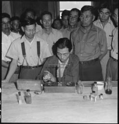 Keywords: Manzanar Relocation Center, Manzanar, California. Chemists, nurserymen, and plant propagators at th . . . - NARA - 538037.jpg Scope and content The full caption for this photograph reads Manzanar Relocation Center Manzanar California Chemists nurserymen and plant propagators at this War Relocation Authority center assemble to witness a new experiment in an attempt to resolve the amount of rubber produced in a small quantity of the guayule plant Frank Hirosawa research rubber chemist is seated in the foreground General notes 538037 Local identifier 210-G-C743 Department of the Interior War Relocation Authority 02/16/1944 - 06/30/1946 NARA-Author Lange Dorothea 1895-1965 Photographer 1372774 <br /> Still Picture Records Section Special Media Archives Services Division NWCS-S National Archives at College Park 8601 Adelphi Road College Park MD 20740-6001 1942-06-28 Record group Record Group 210 Records of the War Relocation Authority 1941 - 1989 Record group ARC 537 Central Photographic File of the War Relocation Authority compiled 1942 - 1945 Series ARC 536000 File unit File unit ARC Variant control numbers NAIL Control Number NWDNS-210-G-C743 Other versions <gallery> File Manzanar_Relocation_Center _Manzanar _California _Chemists _nurserymen _and_plant_propagators_at_th_ _ _ _-_NARA_-_538037 tif tif File Manzanar_Relocation_Center _Manzanar _California _Chemists _nurserymen _and_plant_propagators_at_th_ _ _ _-_NARA_-_538037 jpg jpg </gallery> NARA-cooperation PD-USGov Photographs by Dorothea Lange of Manzanar War Relocation Center |