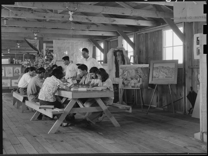 Keywords: Manzanar Relocation Center, Manzanar, California. Class is being held in the Art School at this War . . . - NARA - 538181.jpg Scope and content The full caption for this photograph reads Manzanar Relocation Center Manzanar California Class is being held in the Art School at this War Relocation Authority center for evacuees of Japanese ancestry Instruction is given in oil and water-color life-drawing and sketching lettering poster-making and fashion drawing General notes 538181 Local identifier 210-G-C899 Department of the Interior War Relocation Authority 02/16/1944 - 06/30/1946 NARA-Author Lange Dorothea 1895-1965 Photographer 1372774 <br /> Still Picture Records Section Special Media Archives Services Division NWCS-S National Archives at College Park 8601 Adelphi Road College Park MD 20740-6001 1942-06-30 Record group Record Group 210 Records of the War Relocation Authority 1941 - 1989 Record group ARC 537 Central Photographic File of the War Relocation Authority compiled 1942 - 1945 Series ARC 536000 File unit File unit ARC Variant control numbers NAIL Control Number NWDNS-210-G-C899 Other versions <gallery> File Manzanar_Relocation_Center _Manzanar _California _Class_is_being_held_in_the_Art_School_at_this_War_ _ _ _-_NARA_-_538181 tif tif File Manzanar_Relocation_Center _Manzanar _California _Class_is_being_held_in_the_Art_School_at_this_War_ _ _ _-_NARA_-_538181 jpg jpg </gallery> NARA-cooperation PD-USGov Photographs by Dorothea Lange of Manzanar War Relocation Center |