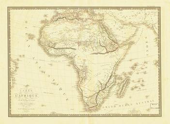Keywords: Map of Africa WDL55.png Artwork ru Б ю Ад иен Юбе 1786-1832 fr Brué Adrien Hubert 1786-1832 en Brué Adrien Hubert 1786-1832 zh 布鲁 阿德里安·休伯特 1786-1832 pt Brué Adrien Hubert 1786-1832 ar بروي أدريان هوبير 1786-1832 es Brué Adrien Hubert 1786-1832 ru Ка та Аф ики fr Carte de l'Afrique en Map of Africa zh 洲 图 pt Mapa da África ar خريطة أفريقيا ru Данная ка та Аф ики составленная в 1820 году Ад иэном Губе ом Б юэ 1782-1832 гг ведущим ка тог афом своего в емени от ажает геог афические знания Аф ики кото ыми асполагала Ев опа в начале XIX века В отличие от многих составителей ка т никогда не бывавших в тех егионах ка ты кото ых они составляли па ижанин Б юэ с молодости очень много путешествовал Он побывал в дальних плаваниях на ост ов ав икий в Индийском океане  И в качестве мичмана участвовал во ф анцузской мо ской экспедиции к авст алийскому побе ежью Однако эти путешествия подо вали здо овье Б юэ поэтому он вынужден был ве нуться в Па иж где под уководством одного из своих бывших команди ов он занялся составлением ка т в бю о военно-мо ской ка тог афии Данная ка та была составлена вско е после экспедиции ф анцузского исследователя Гаспа а-Теодо а оллиена в Сенегал и Гамбию 1818-19 гг В ка ту были включены данные полученные оллиеном в ходе его путешествий а также данные соб анные его п едшественниками и сов еменниками с еди кото ых анго Па к Ген и Солт Джон Льюис Бе кха дт и Джо дж Ф энсис Лион За десять лет до поко ения Ф анцией Алжи а и более чем за сто лет до ев опейской схватки за Аф ику ка та Б юэ показывает насколько значительная часть те ито ии пустыни Саха а и цент альной Аф ики оставалась <i>неисследованной те ито ией </i>для ев опейцев fr Cette carte de l'Afrique de 1820 par Adrien Hubert Brué 1786-1832 l'un des principaux cartographes français de l'époque montre l'état des connaissances géographiques de l Europe au sujet de l'Afrique au début du XIXe siècle Contrairement à de nombreux cartographes sédentaires le Parisien Brué avait beaucoup voyagé dès son enfance en bateau à voile pour de longs voyages vers l'île Maurice dans l'océan Indien et comme aspirant de marine lors d une expédition navale française le long de la côte australienne Ces voyages nuirent toutefois à la santé de Brué si bien qu'il retourna à Paris où il commença à dessiner des cartes sous la direction de l'un de ses anciens commandants au service de cartographie marine Cette carte fut réalisée peu après l'expédition sénégambienne de 1818-1819 de l'explorateur français Gaspard-Théodore Mollien Elle comprend les détails physiques et géographiques tirés des voyages de Mollien ainsi que de prédécesseurs et de contemporains tels que Mungo Park Henry Salt John Lewis Burckhardt et George Francis Lyon Une décennie avant la conquête de l'Algérie par la France et plus d'un demi-siècle avant la « ruée sur l'Afrique » par les Européens la carte de Brué montre l'étendue de l'Afrique saharienne et subsaharienne qui restait <em>terra incognita </em>pour les Européens en This 1820 map of Africa by Adrien Hubert Brué 1786-1832 one of the leading French cartographers of the day shows the state of European geographic knowledge of Africa in the early 19th century Unlike many sedentary mapmakers the Parisian Brué had traveled widely from a young age on long sailing voyages to Mauritius in the Indian Ocean and as a midshipman on a French naval expedition along the Australian coast These voyages damaged Brué s health however so that he returned to Paris where he began to draft maps under the guidance of one of his former commanding officers in the naval cartography bureau This map was made shortly after the 1818-19 Senegambian expedition of French explorer Gaspard-Théodore Mollien It includes physical and geographical details that were learned from Mollien s travels as well as those of predecessors and contemporaries such as Mungo Park Henry Salt John Lewis Burckhardt and George Francis Lyon A decade before the French conquest of Algeria and more than a half century prior to the European scramble for Africa Brué s map shows how much of Saharan and sub-Saharan central Africa remained <i>terra incognita </i>for Europeans zh 这幅由 Adrien Hubert Brué(1786-1832 年)绘制的 1820 年 洲 图向人们显示了 19 世纪早 欧洲对 洲 理知识的了解情况 Adrien Hubert Brué 是当时法国 图绘制领域的领导人物 与其他 欢闭门 车的制图师不同,Parisian Brué 年轻时就游历广泛,曾长 航行到印度洋的毛里求斯,并 为 名海军军官学校学员参加了法国海军 征澳大利亚海岸 这些航行损害了 Brué 的健康,因此他回到了巴黎,并 位原海军制图 指挥官的指导下 始绘制 图 这幅 图就绘制于 1818-19 年法国探险家 Gaspard-Théodore Mollien 的塞内冈比亚 征之后不久 该 图包括很多自