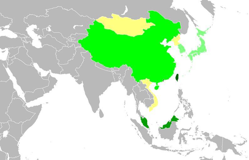 | Keywords: Map-Chinese Characters.png Countries modern boundaries drawn where Chinese characters were/are used in its official/dominant language or at least one of its official/dominant languages color 002200 Dark Green - Traditional Chinese characters used exclusively or almost exclusively Taiwan Hong Kong and Macau GREEN Medium Green - Simplified Chinese characters used formally but traditional characters continue to be used widely Singapore and Malaysia 00EE00 Green - Simplified Chinese characters used exclusively or almost exclusively Mainland China LIGHTGREEN Light Green- Chinese characters used in conjunction with other systems of writing in the same language Japan ffff00 Light Yellow - Chinese characters were once used in the official language but is not used any more South Korea North Korea Mongolia and Viet Nam Paesi confini moderni disegnati dove i caratteri cinesi erano/sono utilizzati nella sua lingua ufficiale/dominante o almeno una delle sue lingue ufficiali/dominanti Color 002200 Verde Scuro - caratteri cinesi tradizionali utilizzati esclusivamente o quasi esclusivamente Taiwan Hong Kong e Macao GREEN Verde medio - caratteri cinesi semplificati utilizzati formalmente ma i caratteri tradizionali continuano ad essere ampiamente utilizzato Singapore e Malesia 00EE00 Verde- caratteri cinesi semplificati utilizzati esclusivamente o quasi esclusivamente Cina continentale lightgreen Verde chiaro- caratter icinesi utilizzati in combinazione con altri sistemi di scrittura nella stessa lingua Giappone e Corea del Sud FFFF00 Giallo - caratteri cinesi una volta usati nella lingua ufficiale ma attualmente non più utilizzati Corea del Nord Mongolia e Vietnam 曾 或現 官方或主流語文中使用漢字的 家和 (以現代邊界畫出) color 002200 深綠色:主要使用繁體字/正體字的 (台灣 香港 澳 ) GREEN 綠色:正式採用簡化字,但也使用繁體字的 (新加 馬來西亞) 00EE00 綠色:主要使用簡化字的 (中 大陸) LIGHTGREEN 綠色:漢字與其他書寫系統 同 語 中並用的 (日) ffff00 淺黃色:曾經使用漢字的 (越南 北韓 南韓 蒙古) 曾 或现 官方或主流语文中使用汉字的国家和 区(以现代边界画出) color 002200 深绿色:主要使用繁体字 正体字的 区(台湾 香港 澳门) GREEN 绿色:正式采用 化字,但也使用繁体字的 区(新加 马 西亚) 00EE00 绿色:主要使用 化字为主的 区(中国大陆) LIGHTGREEN 绿色:汉字与其他书写系统 同 语 中并用的 区(日) ffff00 浅黄色:曾经使用汉字的 区(越南 韩国 蒙古国) color 002200 Темно-зелёный Ст аны официально или п еимущественно использующие т адиционные ие оглифы Тайвань Гонконг акао GREEN Зелёный алайзия ст ана официально использующая уп ощённые ие оглифы п и частом упот еблении т адиционных ие оглифов 00EE00 Светло-зелёный Ст аны официально использующие уп ощённые ие оглифы мате иковый Китай Сингапу LIGHTGREEN Жёлтый Ст аны некогда анее в своей исто ии использовавшие ие оглифы но в данное в емя их уже не использующие Вьетнам Ко ея монголия Những quốc gia và vùng lãnh thổ chịu ảnh hưởng của chữ Hán color 002200 Xanh lục đậm chữ Hán phồn thể được dùng chính thức Trung Hoa Dân Quốc Ma Cao và Hồng Kông GREEN Xanh lục chữ Hán giản thể được dùng chính thức nhưng chữ Hán phồn thể vẫn thông dụng Singapore và Mã Lai 00EE00 Xanh lá mạ chữ Hán giản thể được dùng chính thức CHND Trung Hoa LIGHTGREEN Xanh lục nhạt được sử dụng song song với hệ chữ viết khác trong cùng ngôn ngữ Hàn Quốc và Nhật Bản ffff00 Vàng trước đây đã từng được dùng chính thức nhưng nay không dùng nữa Mông Cổ CHDCND Triều Tiên và Việt Nam Atelier graphique carte Yug 2005-12-09 Yug Maps of writing systems in the world Chinese characters |