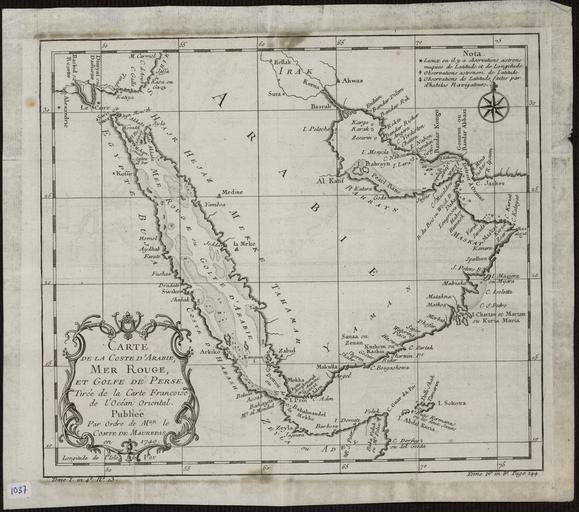 | Keywords: Map of the Coast of Arabia, the Red Sea and the Persian Gulf WDL2918.png Artwork ru о епас Жан-Ф еде ик Фелипо г аф де 1701-1781 fr Maurepas Jean-Frédéric Phélypeaux 1701-1781 en Maurepas Jean-Frédéric Phélypeaux 1701-1781 zh 马蕾帕 让-弗雷德里克·菲利波 1701-1781 pt Maurepas Jean-Frédéric Phélypeaux 1701-1781 ar موريباس جين-فيديريك فيليبو 1701-1781 es Maurepas Jean-Frédéric Phélypeaux 1701-1781 ru Ка та побе ежья А авийского мо я К асного мо я и Пе сидского залива fr Carte de la côte d'Arabie de la mer Rouge et du golfe Persique en Map of the Coast of Arabia the Red Sea and the Persian Gulf zh 沙特阿拉伯海岸 红海和波斯湾 图 pt Mapa da Costa da Arábia do Mar Vermelho e do Golfo Pérsico ar خريطة ساحل الجزيرة العربية والبحر الأحمر والخليج الفارسي ru Эта ка та 1740 года была создана ф анцузским ка тог афом и гид ог афом Жаком- иколя Белленом 1703-1772 гг Она была издана по п иказу Жана-Ф еде ика Фелипо г афа де о епа 1701-1781 гг госуда ственного сек ета я п и ко оле Людовике XV Ка та посвящена исключительно бе еговым линиям и не дает под обных сведений о внут енней те ито ии А авийского полуост ова а ней отмечены жемчужные бе ега вдоль побе ежья Бах ейна до Джульфа а Ката отмечен как Ката а однако занимаемый им полуост ов наче чен неве но Кувейта на ка те нет а ост ов Пелех указан К асное мо е отмечено как Mer Rouge ou Golfe d Arabie К асное мо е или залив А авии П имечание в ве хнем п авом углу поясняет использование т ех символов звездой отмечены места асположение кото ых оп еделено по аст ономическим данным ши оты и долготы; к естом отмечены места асположение кото ых оп еделено только по аст ономическим данным ши оты; а видоизмененным к естом отмечены места асположение кото ых оп еделено по ши оте искусными мо еплавателями <br>А авийский залив; А авийский полуост ов; Пе сидский залив fr Cette carte de 1740 est l'œuvre du cartographe et hydrographe français Jacques-Nicolas Bellin 1703-72 Elle fut publiée sur ordre de Jean-Frédéric Phélypeaux Comte de Maurepas 1701-81 secrétaire d'état sous le règne du roi Louis XV La carte s'intéresse exclusivement aux côtes et ne fournit aucun détail sur l'intérieur de la Péninsule arabique Elle indique les bancs de perles le long de la côte de Bahrein à Juffar Le Qatar est indiqué Katara mais la péninsule qu'il occupe n'est pas dessinée avec exactitude Le Koweït n'apparaît pas mais l'île de Peleche est indiquée La Mer Rouge est indiquée comme la Mer Rouge ou Golfe d'Arabie La note en haut à droite explique l'utilisation de trois symboles différents une étoile pour indiquer les lieux dont les emplacements ont été déterminés par des observations astronomiques de latitude et longitude ; une croix pour indiquer les lieux dont les emplacements ont été définis par les observations astronomiques de la seule latitude ; et une croix modifiée pour indiquer les lieux dont les emplacements ont été établis par les observations de latitudes faites par des navigateurs expérimentés <br>Golfe Arabique; Péninsule arabique; Golfe Persique en This 1740 map is by the French cartographer and hydrographer Jacques-Nicolas Bellin 1703-72 It was published by order of Jean-Frédéric Phélypeaux Count de Maurepas 1701-81 secretary of state under King Louis XV The map focuses exclusively on the coastlines and provides no detail about the interior of the Arabian Peninsula It shows pearl banks along the coast from Bahrain to Julfar Qatar is noted Katara but the peninsula that it occupies is not accurately drawn Kuwait is not shown but the island of Peleche is indicated The Red Sea is indicated as Mer Rouge ou Golfe d Arabie the Red Sea or the Gulf of Arabia The note at upper right explains the use of three different symbols a star to indicate places whose locations had been determined by astronomical observations of latitude and longitude; a cross to indicate places whose locations had been determined by astronomical observations of only latitude; and a modified cross to indicate places whose locations had been determined by latitudinal observations made by skilled navigators <br>Arabian Gulf; Arabian Peninsula; Persian Gulf zh 这幅 1740 年 图是法国制图师和水文学家雅克·尼古拉斯· 林(1703 - 72 年)的 品 该 图是根据法国国王路易十五国务秘书莫尔帕伯爵让-弗雷德里克·菲利波伯爵(1701-81 年)的命令出版的 该 图专门绘制了海岸线,对阿拉伯半岛的内陆 区没 提供任何详细信息 该 图绘制了沿巴林到 Julfar 海岸的珍珠沙洲 图标注了卡塔尔( Katara ),但是其 占据的半岛却没 准确的画出 该 图上没 科威特,但是指出了 Peleche 岛 红海被标注为 Mer Rouge ou Golfe d Arabie (红海或阿拉伯海湾 右上角的注释对 使用的不同符号进行了说明:星号表示该 点已经 过经度和纬度的天文观测确定过;叉号表示该 点的位置 过天文观测的(只)确定过纬度; 变体叉号则表示该 点的位置被经验丰富的航